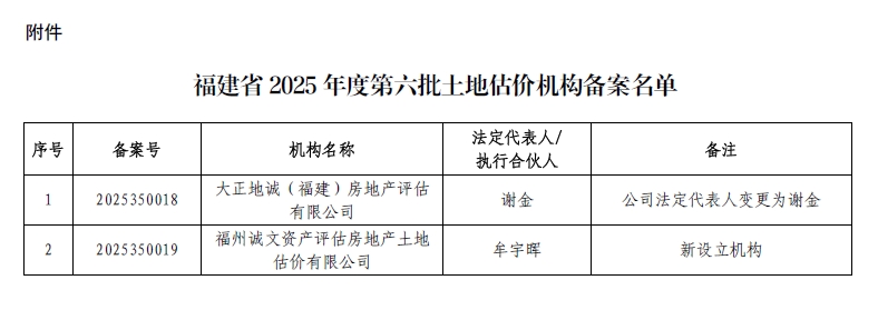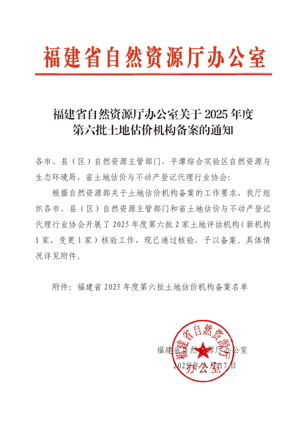福建省自然资源厅办公室关于2025年度第六批土地估价机构备案的通知