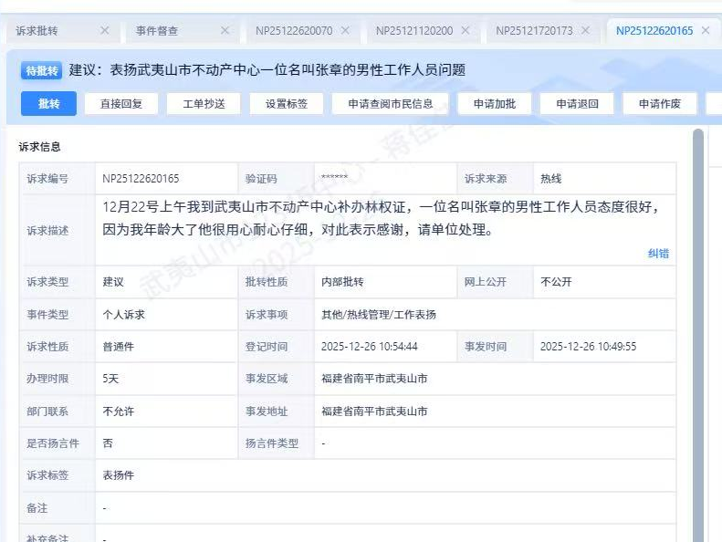 近日,武夷山市12345政务服务热线收到一张特殊工单——一位年长市民建议表扬不动产登记服务。
