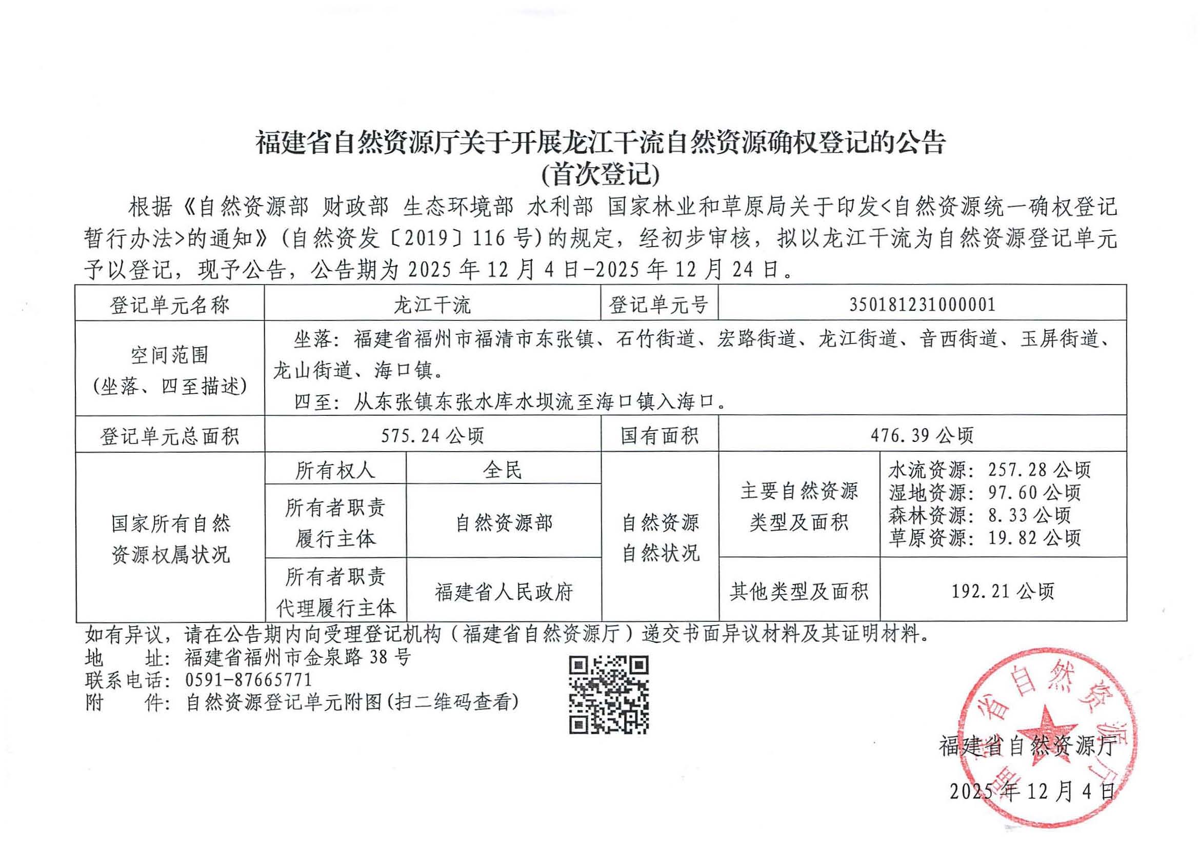 福建省自然资源厅关于开展龙江干流自然资源确权登记的公告