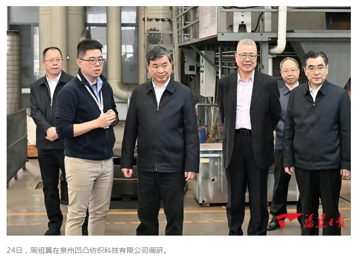 位于泉州台商投资区的凹凸纺织科技有限公司,是国内成规模专业制造针织圆机的知名台资企业,多项产品属于国内首创。周祖翼察看了企业纺织产品展示,了解企业在闽投资发展和产品研发、市场营销等情况;深入自动化纺布调试车间、雕刻车间和车工部,察看智能化数控加工生产线等,询问智改数转及安全生产工作。周祖翼与台企负责人深入交流,希望企业扎根泉州、专注主业,坚定信心、把握机遇,聚焦关键领域和市场需求,加大力度推动技术创新、产品更新,积极开拓市场,形成产业集群。希望他们积极推介福建,带动更多台商台企来福建投资兴业,加快闽台优势产业融合发展。