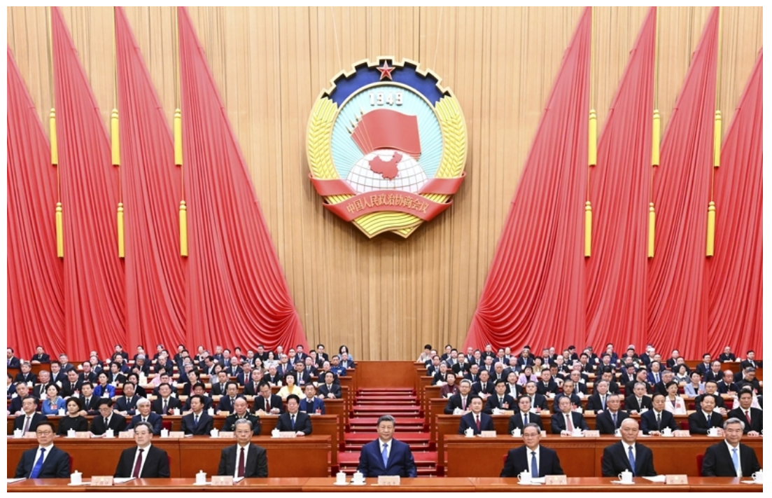 三月的北京,春启华章。人民大会堂大礼堂灯光璀璨,气氛隆重热烈。中国人民政治协商会议会徽悬挂在主席台正中,十面鲜艳的红旗分列两侧。
