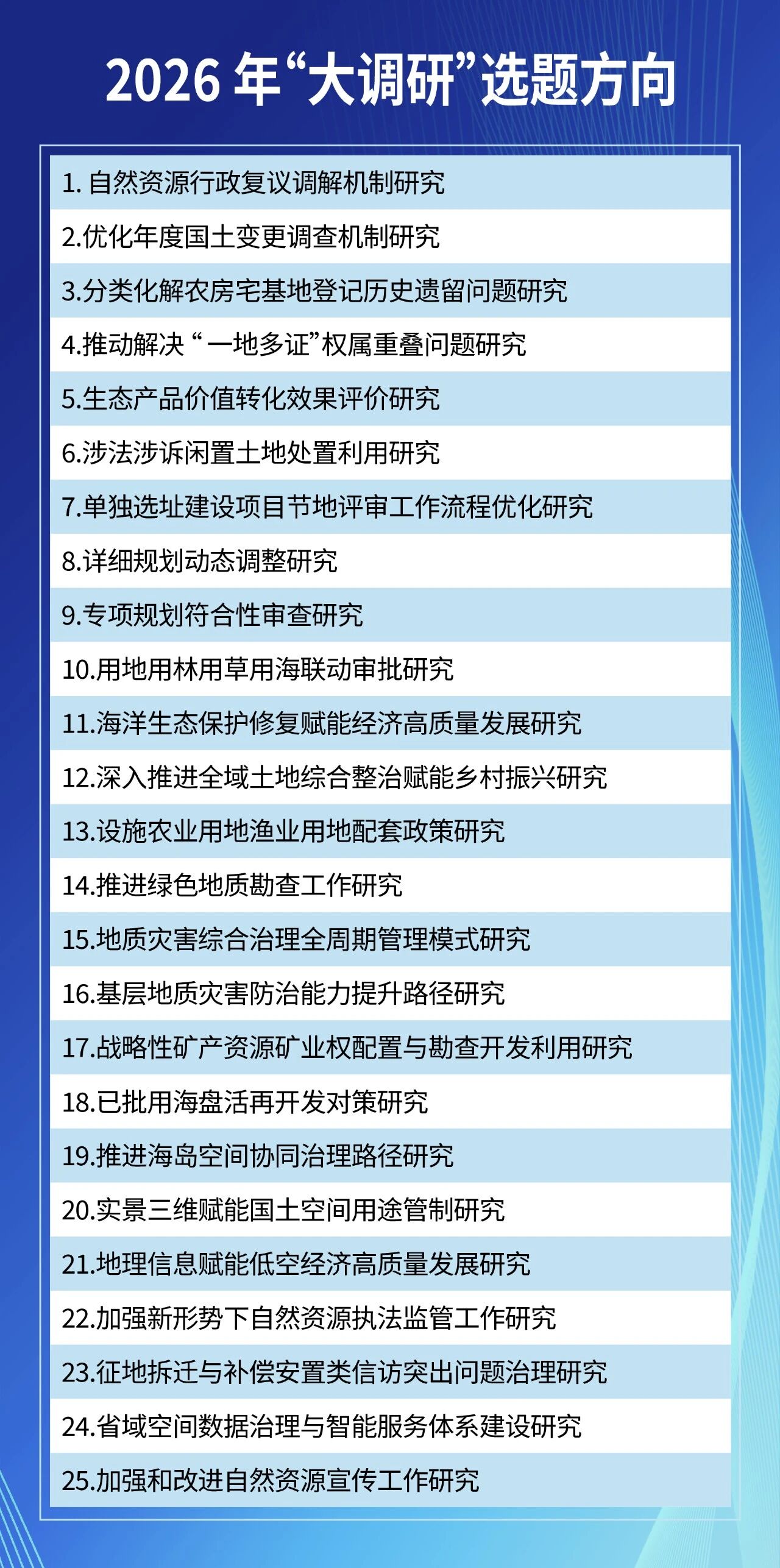 本次全省自然资源系统“大调研”活动中,厅领导带队组织实施4个重点调研课题,具体为“基于我省典型区域风险精细调查下的地质灾害防控对策研究”“加强自然资源要素审批监督,护航营商环境不断优化”“省域空间数据治理与智能服务体系建设研究”“优化自然资源要素配置和惠企政策供给,赋能我省民营经济、支撑现代化产业体系建设的机制和路径研究”。同时,围绕自然资源核心职责、2026年度重点工作、“十五五”规划目标任务等,提供25个调研选题方向,供全省自然资源系统各单位参考选择,以提升调研的针对性和实效性。