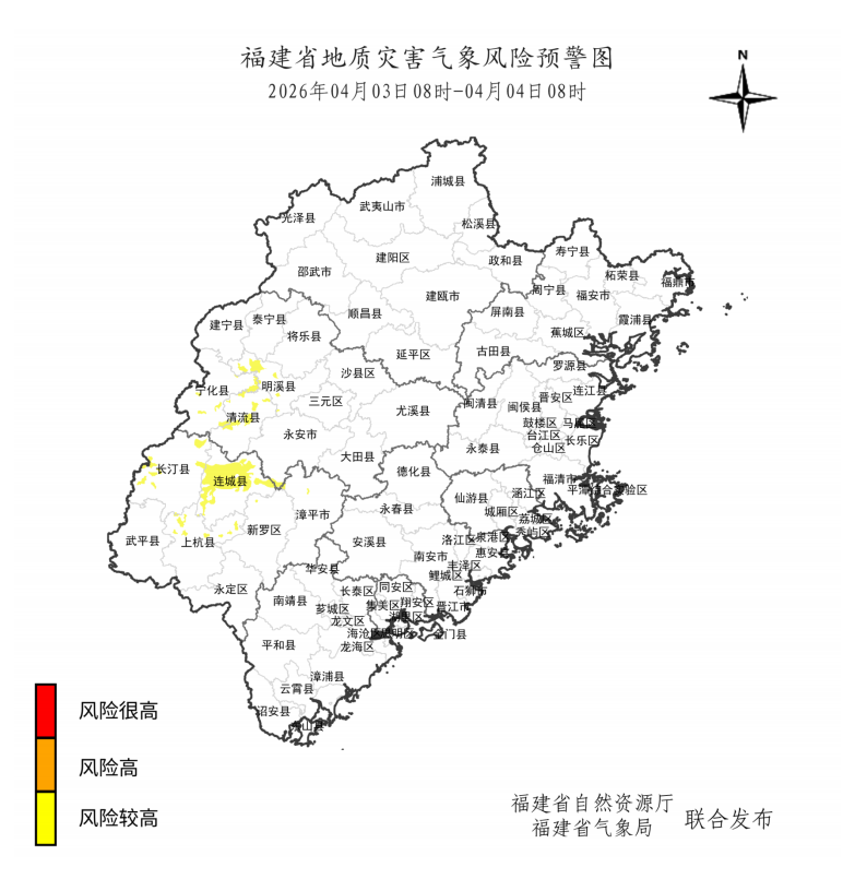 预计,4月3日8时至4月4日8时,三明市永安市、明溪县、清流县、宁化县,龙岩市新罗区、上杭县、长汀县、连城县、漳平市等局部地区发生地质灾害的风险较高(黄色预警),应加强对地质灾害隐患点的监测和对高陡边坡、易发泥石流的沟口等易发区的巡查和防范,如果发现地灾险情应及时采取防灾避险措施,确保人民生命安全。【省地质环境监测中心】