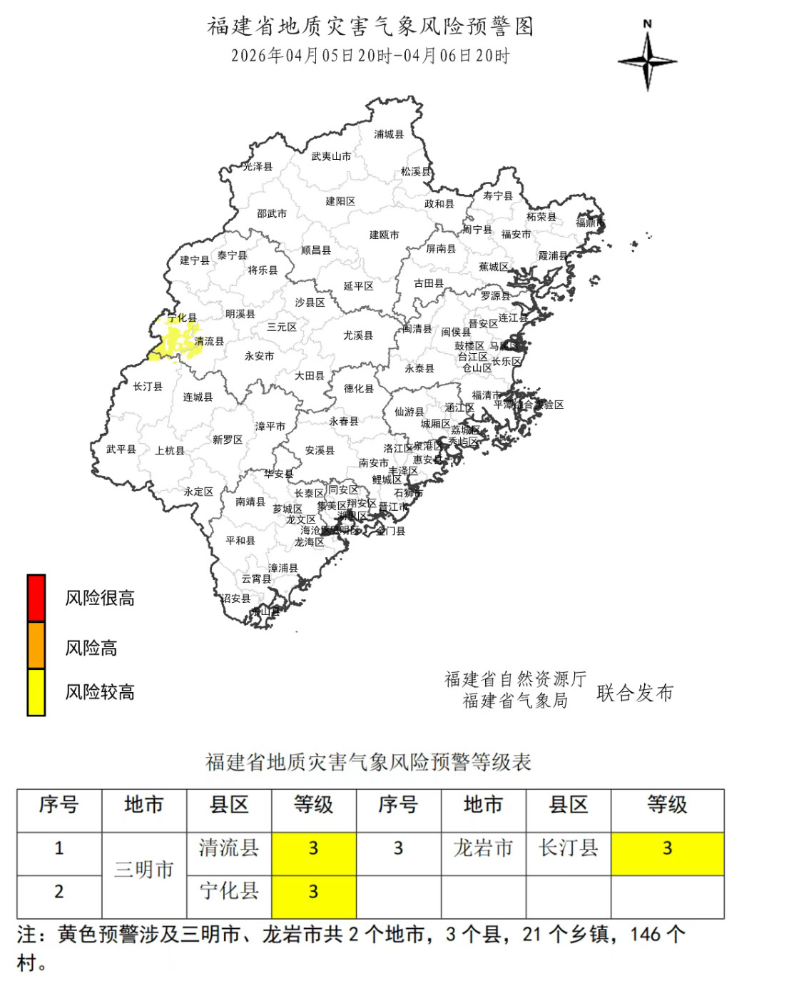 预计,4月5日20时至4月6日20时,三明市清流县、宁化县,龙岩市长汀县等局部地区地质灾害发生的风险较高(黄色预警),应加强对地质灾害隐患点的监测和对高陡边坡、易发泥石流的沟口等易发区的巡查和防范,如果发现地灾险情应及时采取防灾避险措施,确保人民生命安全。【省地质环境监测中心】