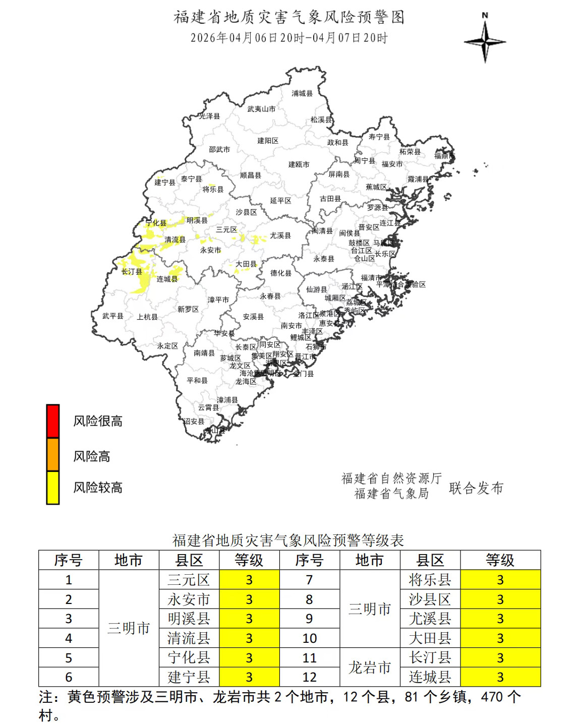 预计,4月6日20时至4月7日20时,三明、龙岩市局部等地区地质灾害发生的风险较高(黄色预警),应加强对地质灾害隐患点的监测和对高陡边坡、易发泥石流的沟口等易发区的巡查和防范,如果发现地灾险情应及时采取防灾避险措施,确保人民生命安全。【省地质环境监测中心】