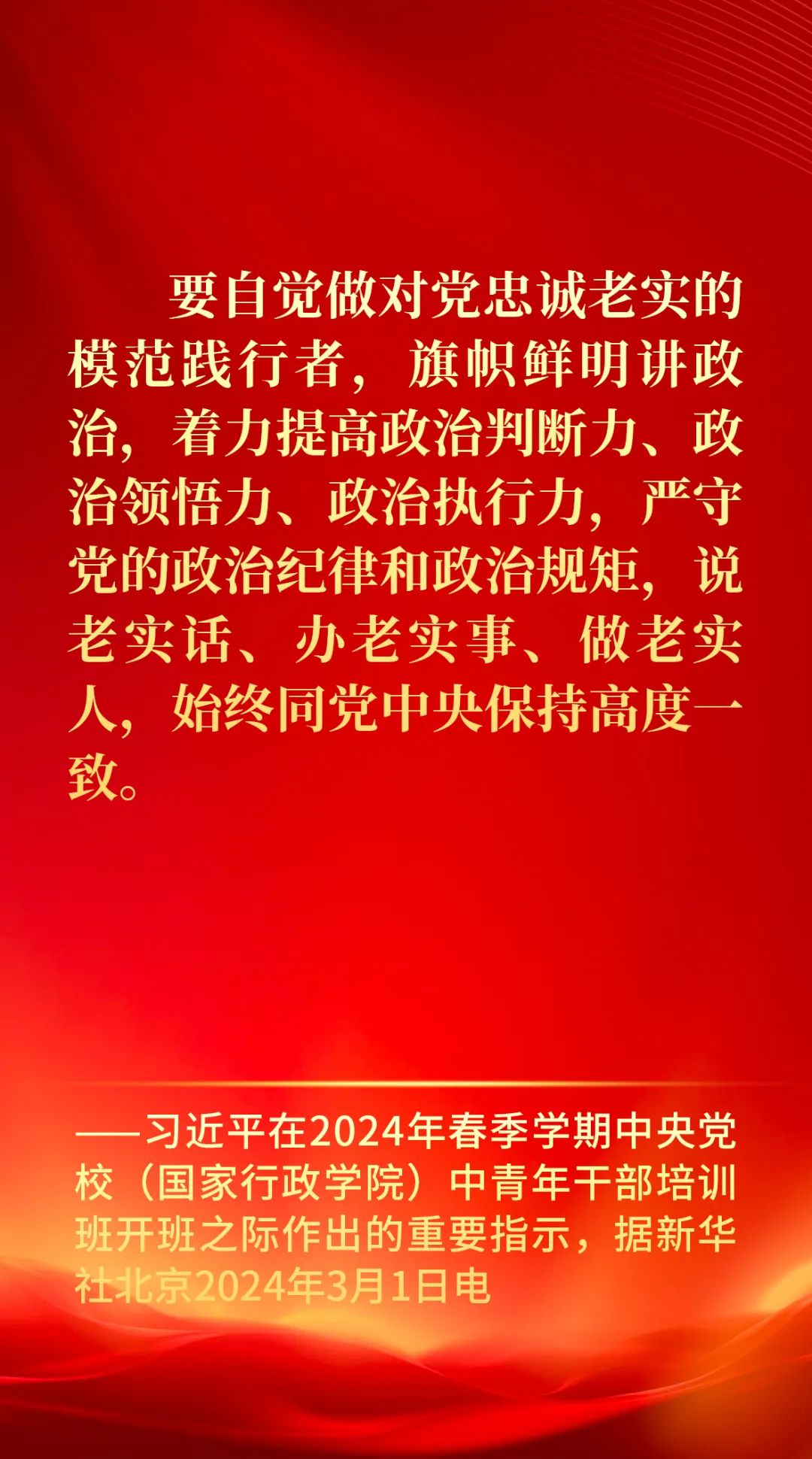要自觉做对党忠诚老实的模范践行者,旗帜鲜明讲政治,着力提高政治判断力、政治领悟力、政治执行力,严守党的政治纪律和政治规矩,说老实话、办老实事、做老实人,始终同党中央保持高度一致。
