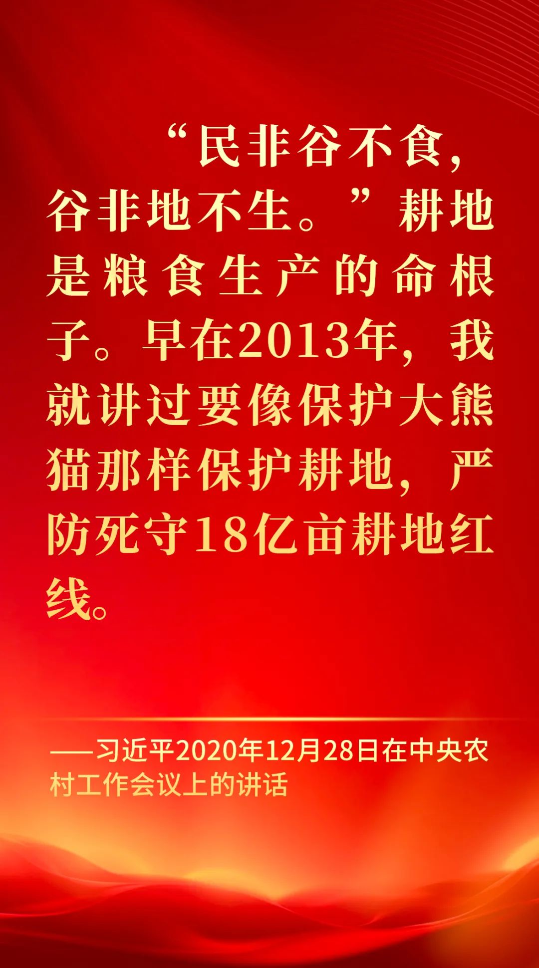“民非谷不食,谷非地不生。”耕地是粮食生产的命根子。早在2013年,我就讲过要像保护大熊猫那样保护耕地,严防死守18亿亩耕地红线。