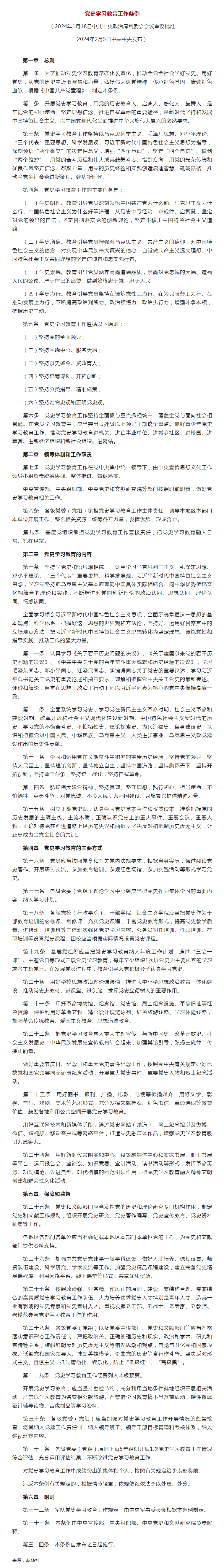 近日,中共中央印发了《党史学习教育工作条例》(以下简称《条例》),并发出通知,要求各地区各部门认真遵照执行。