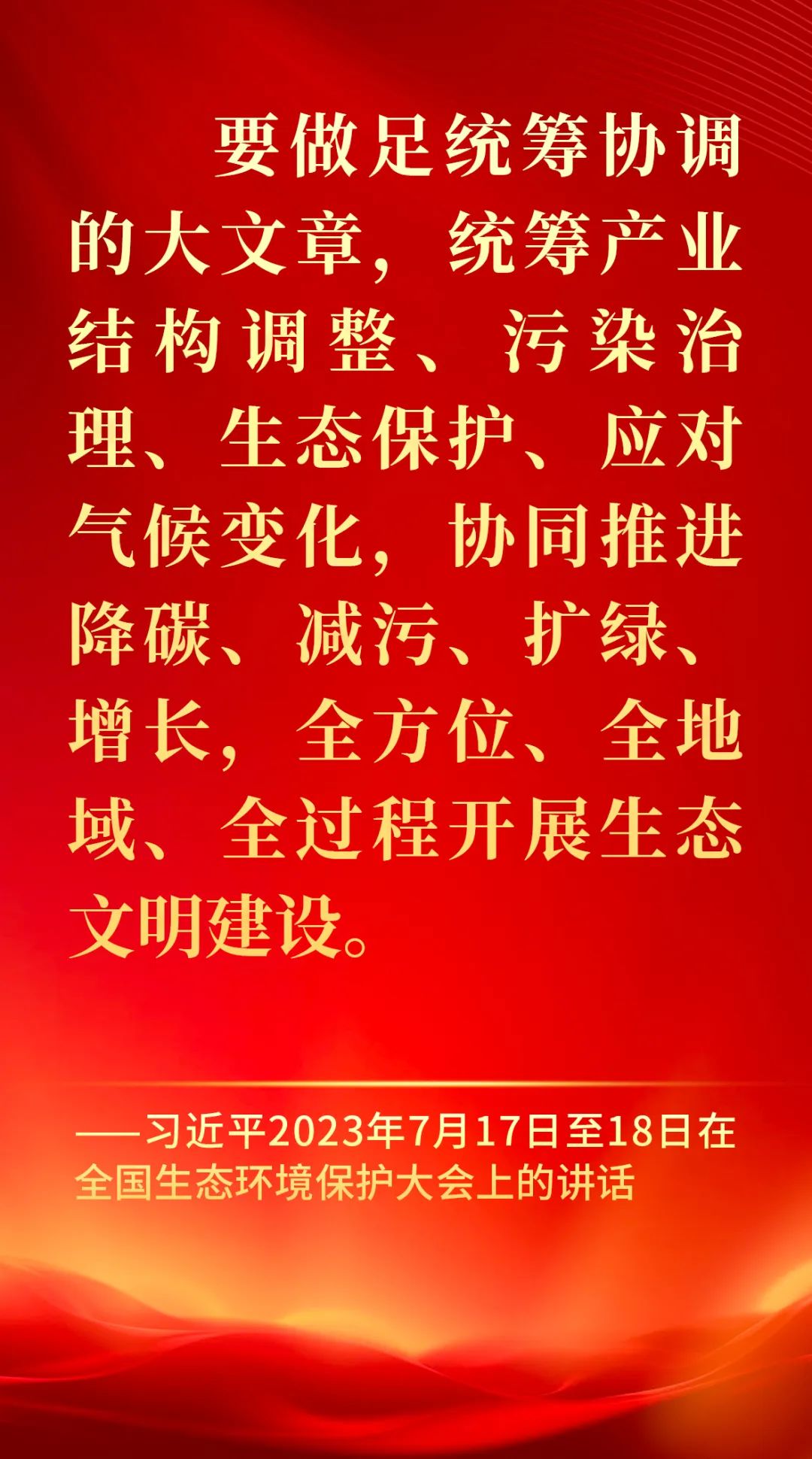 要做足统筹协调的大文章,统筹产业结构调整、污染治理、生态保护、应对气候变化,协同推进降碳、减污、扩绿、增长,全方位、全地域、全过程开展生态文明建设。