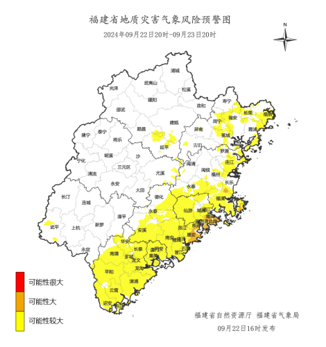 预计,9月22日20时至9月23日20时,福州市长乐区、福清市,莆田市荔城区、秀屿区,泉州市泉港区、惠安县,平潭综合实验区,地质灾害气象风险等级为橙色预警,地质灾害发生可能性大,应做好值班值守、监测、巡查和防范,应按有关规定及时组织危险性较大的地灾隐患点和危险区域内的群众转移,确保人民生命安全。