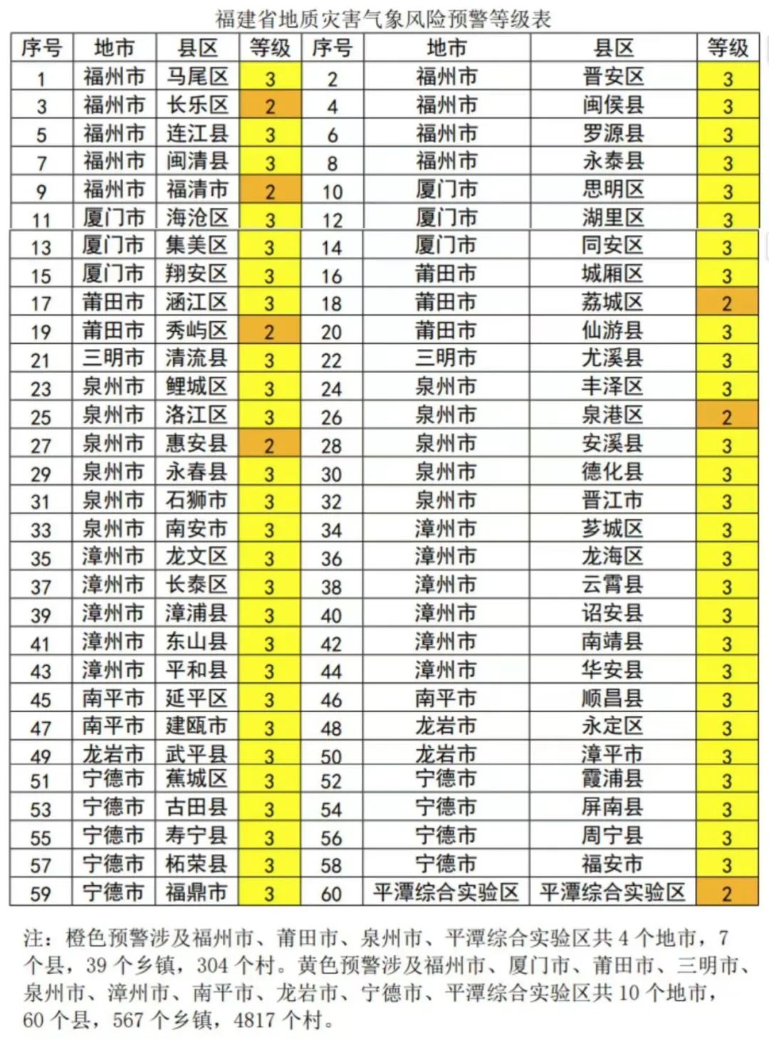 福州市马尾区、晋安区、闽侯县、连江县、罗源县、闽清县、永泰县,厦门市思明区、海沧区、湖里区、集美区、同安区、翔安区,莆田市城厢区、涵江区、仙游县,三明市清流县、尤溪县,泉州市鲤城区、丰泽区、洛江区、安溪县、永春县、德化县、石狮市、晋江市、南安市,漳州市芗城区、龙文区、龙海区、长泰区、云霄县、漳浦县、诏安县、东山县、南靖县、平和县、华安县,南平市延平区、顺昌县、建瓯市,龙岩市永定区、武平县、漳平市,宁德市蕉城区、霞浦县、古田县、屏南县、寿宁县、周宁县、柘荣县、福安市、福鼎市,地质灾害气象风险等级为黄色预警,地质灾害发生可能性较大,应加强对地质灾害隐患点的监测和对高陡边坡、易发泥石流的沟口等易发区的巡查和防范,如果发现地灾险情应及时采取防灾避险措施,确保人民生命安全。【省地质环境监测中心】
